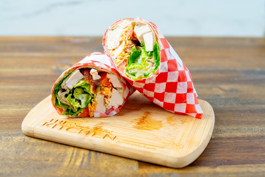 Sliced chicken, romaine, bacon, ranch, tomato and lettuce, cheddar