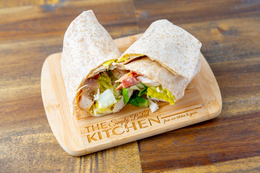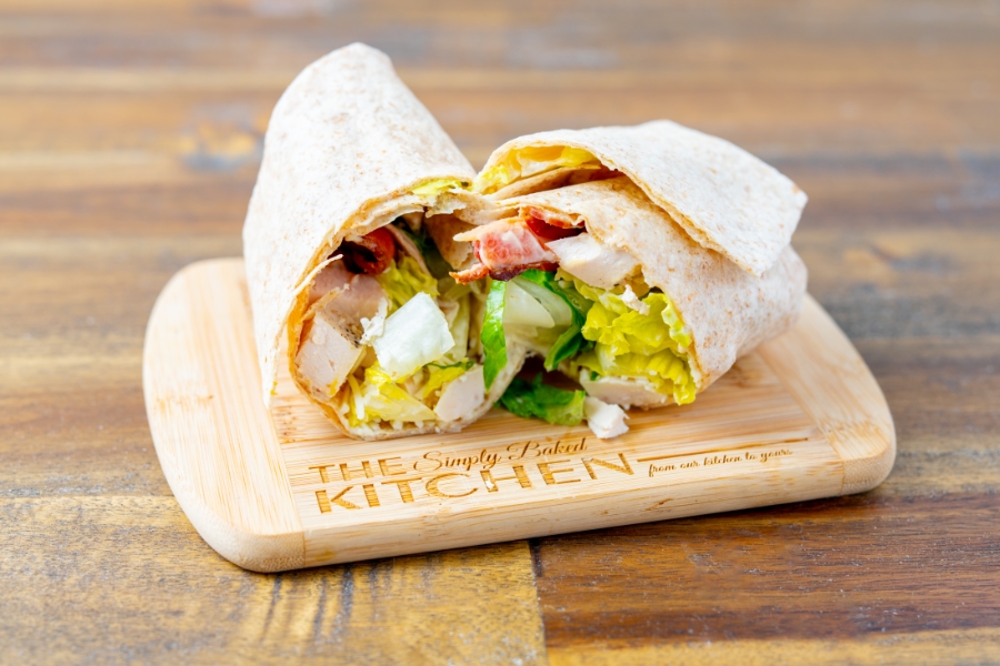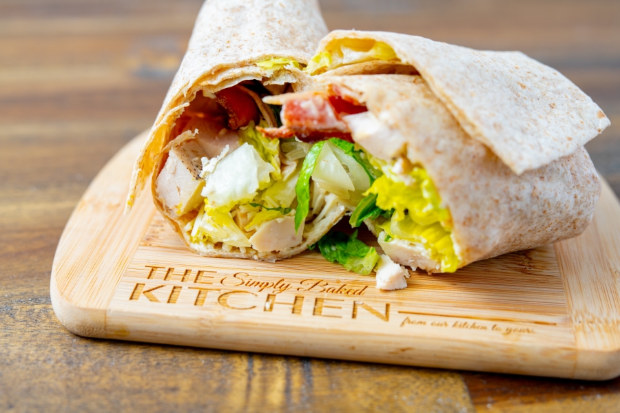 Sliced chicken, romaine, bacon, parmesan, Caesar dressing, wrap